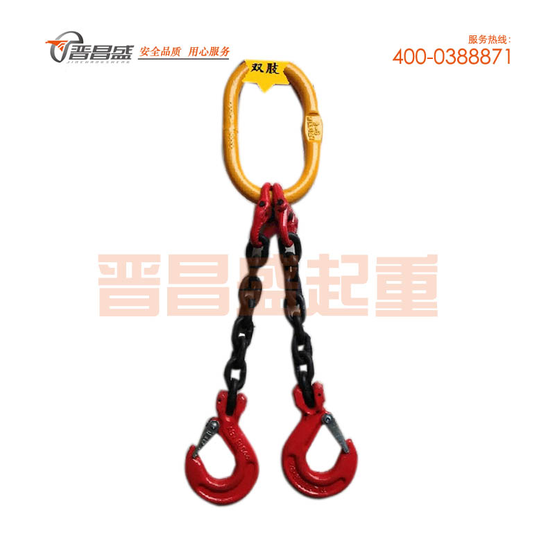 1、該索具可以作為單肢捆綁索具使用,當單肢捆綁索具使用時只需將吊鉤鉤入鏈條,此時額定載荷將降低20%。