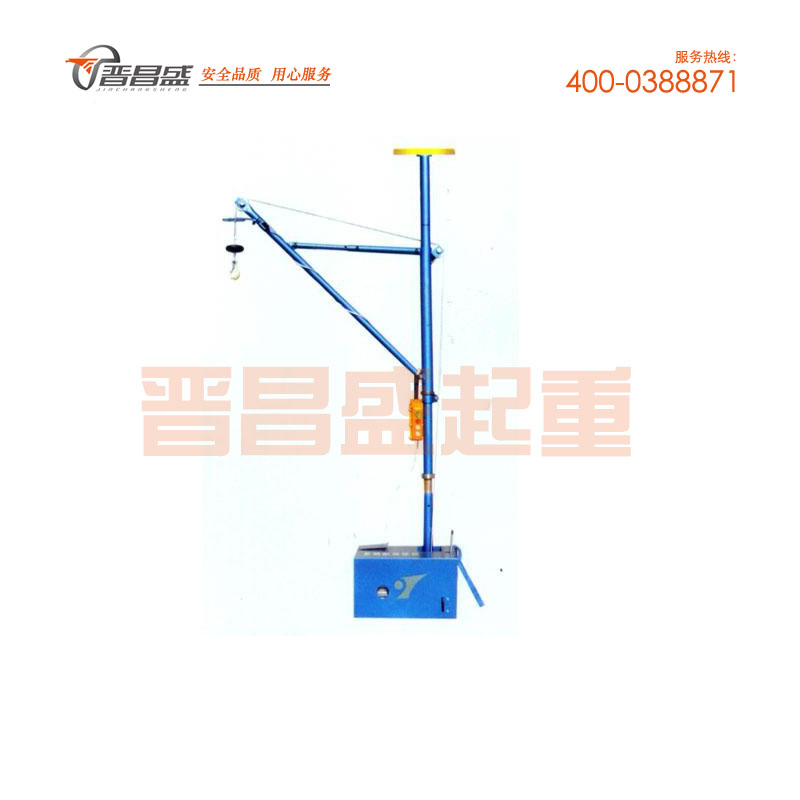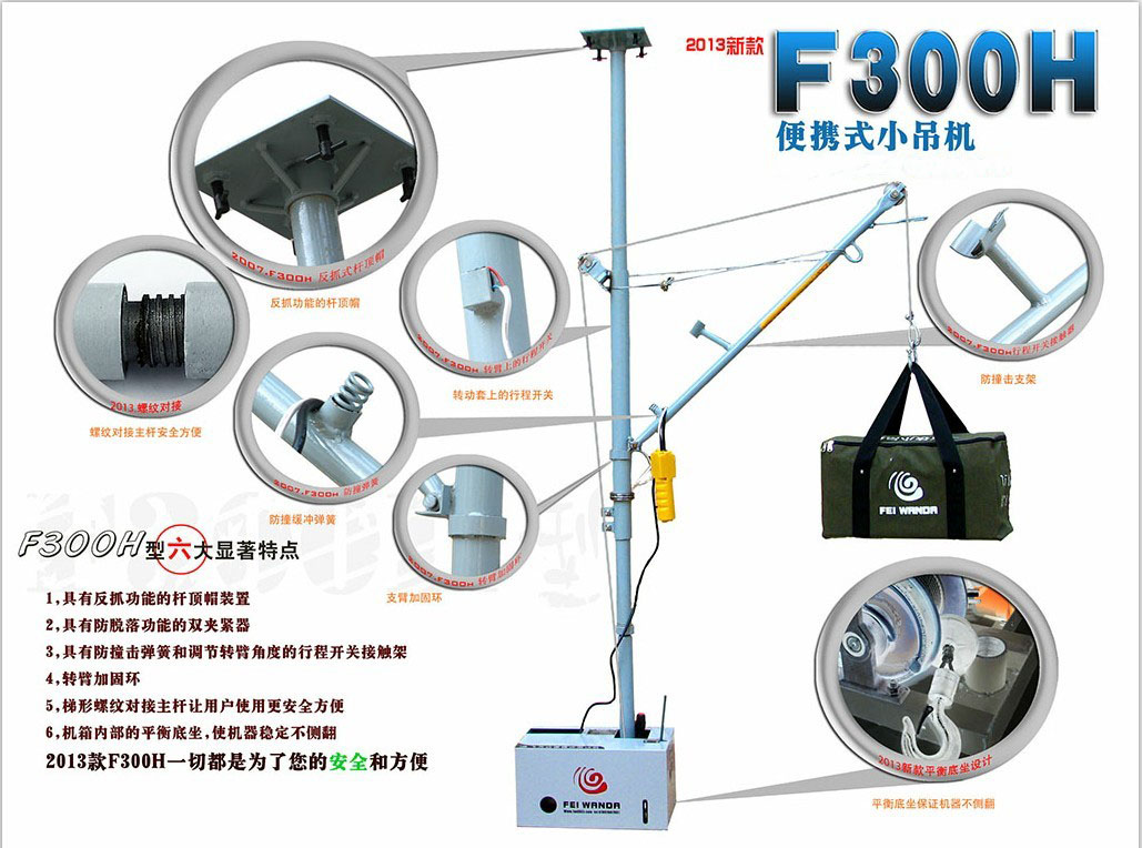 便攜式小吊機產品介紹 1、具有反抓功能的桿頂帽裝置 2、具有防脫落功能的雙夾緊器 3、轉臂加固環 4、梯形螺紋對接主桿讓用戶使用更安全方便 5、機箱內部的平衡底坐,使機器穩定不側翻