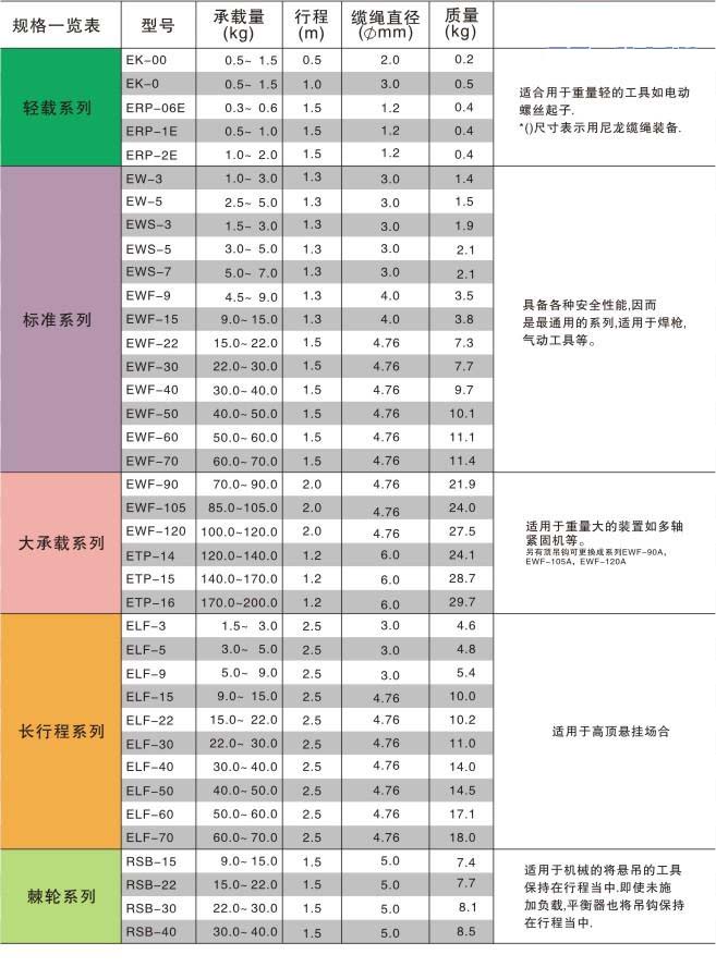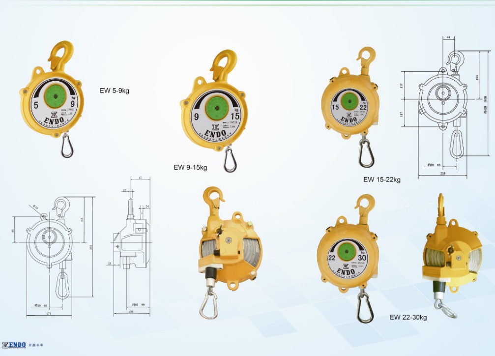 日本遠藤彈簧平衡器是一種機械操作時使用的輔助工具,主要運用在工廠車間的流水生產線上,日本遠藤彈簧平衡器主要借助拉簧的力量使所懸掛的被吊物體處于無重狀態,從而減少勞動強度,增加工作效率,降低您的生產成本,日本遠藤彈簧平衡器是工廠流水線不可缺少的工具之一。 1、平衡器可改進工作效率和減少操作者疲勞。 2、平衡器可使工具的位置穩定,有助于精確工作。 3、平衡器可用來保持工具的潔凈。 4、無需電源或空氣源,實現安全工作。 5、封閉式殼體及纜繩導向裝置可防止夾手指事故及擦傷殼體。